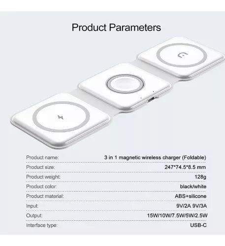 - ¿Qué incluye la caja? Incluye el cargador inalámbrico 3 en 1 y un cable USB-C.